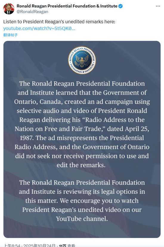 里根总统基金会和研究所在社交平台上表示对广告的不满